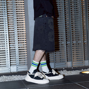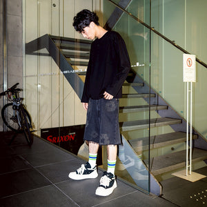 ブラックモノトーンで洗練された印象を与えるリースデザインデニムショーツ。