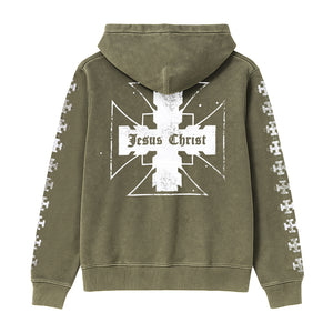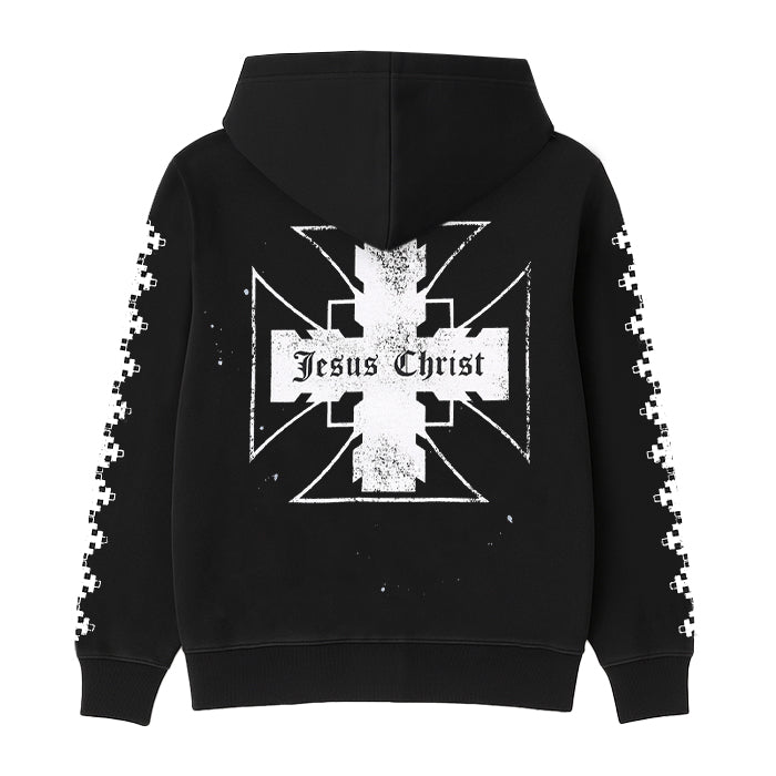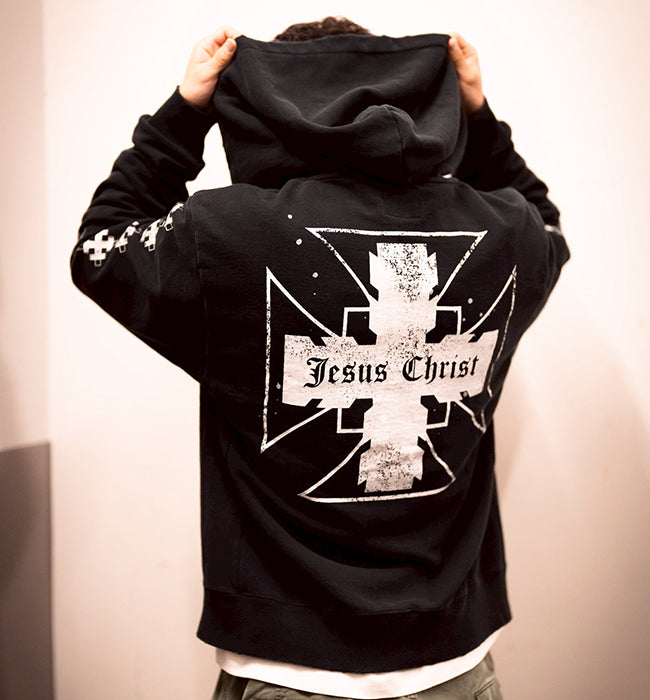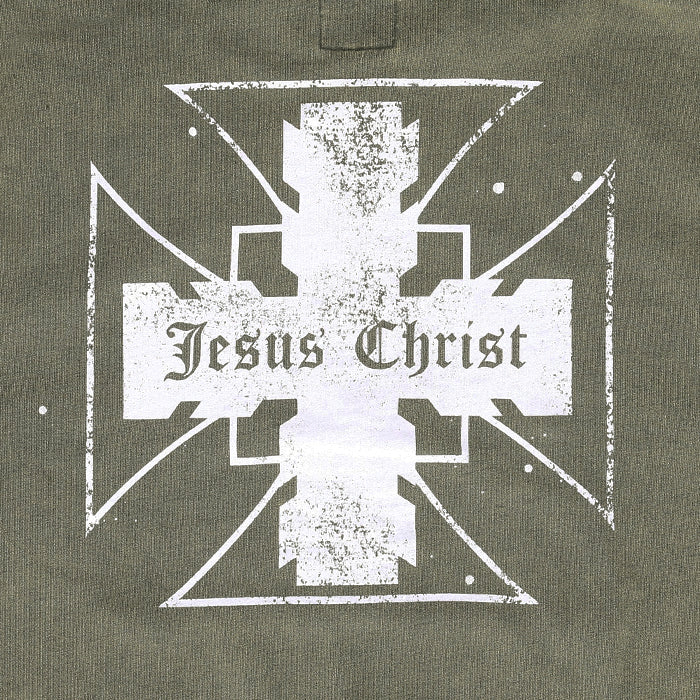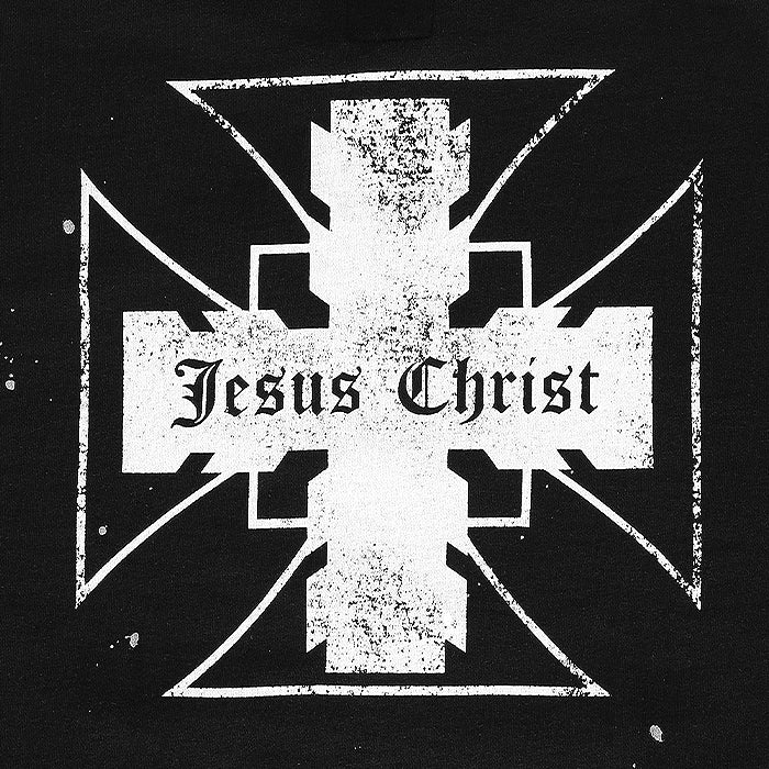 大胆に「Jesus Christ」と描かれたクロスモチーフをプリント。