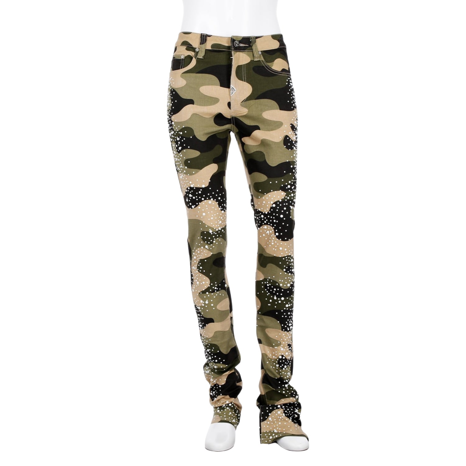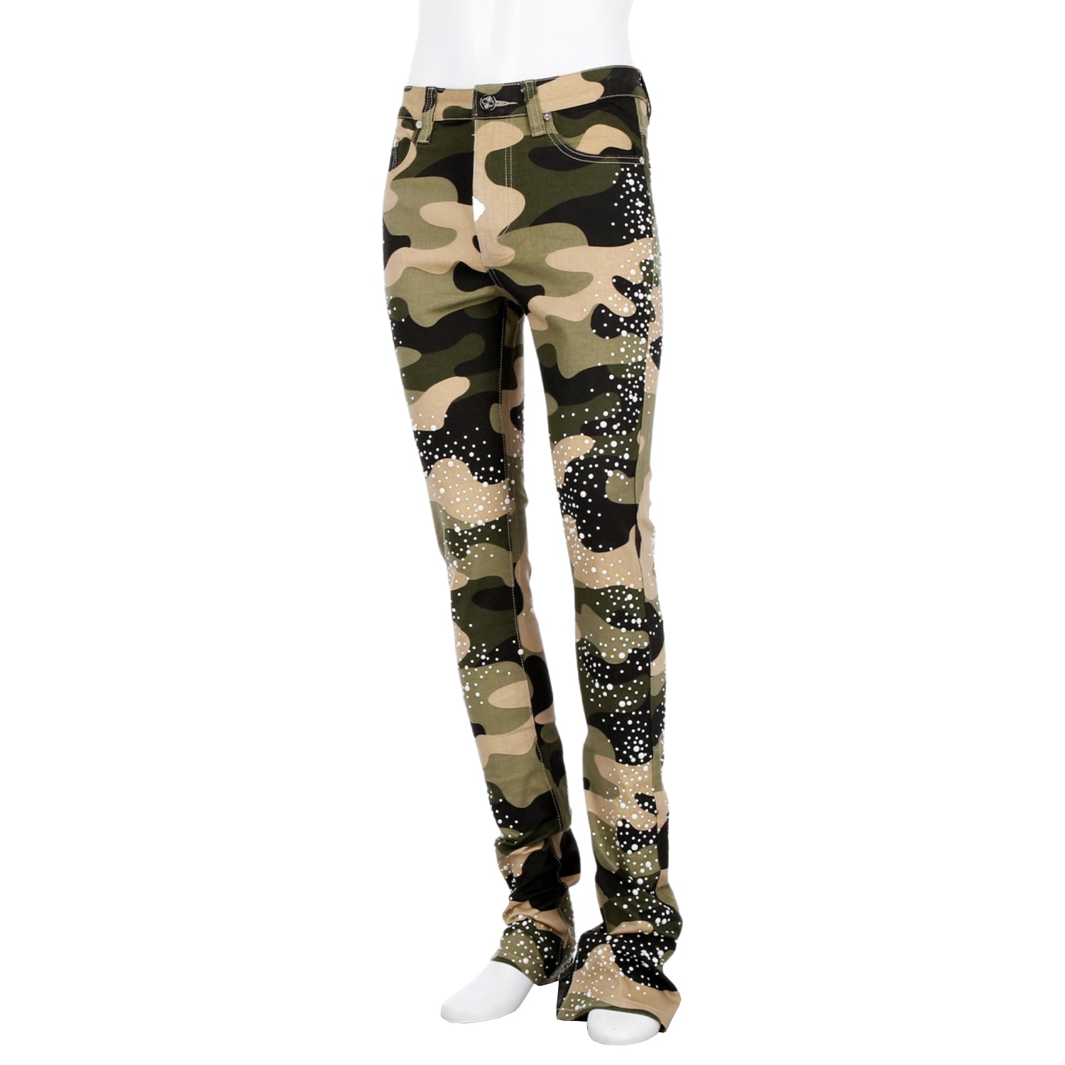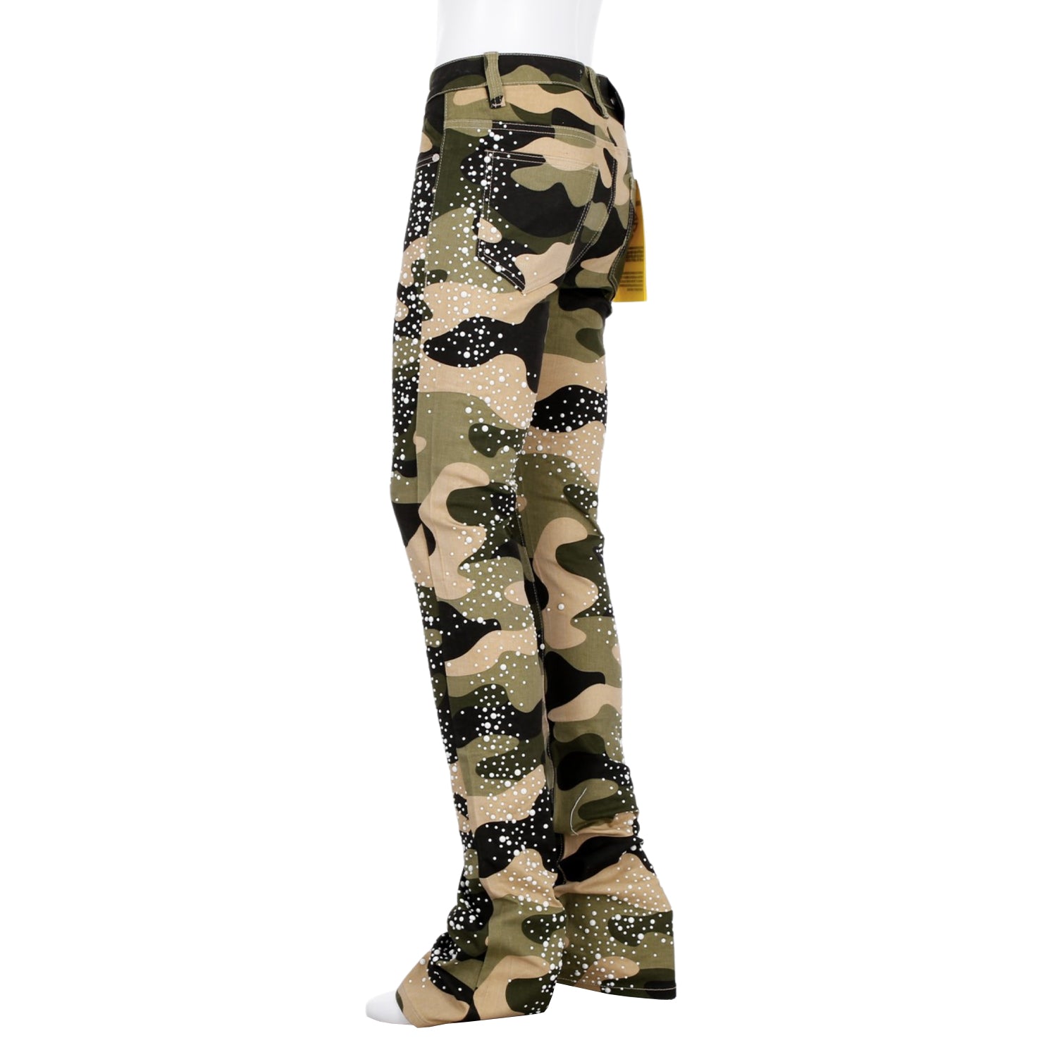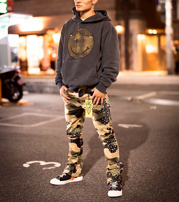 大胆なカモフラージュ柄に、パールのような装飾を無数に施したストリートファッションに新たなラグジュアリーの風を吹き込む一本。