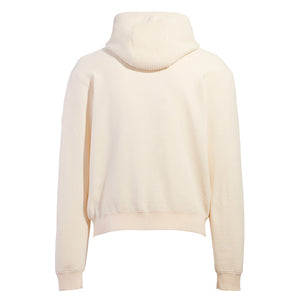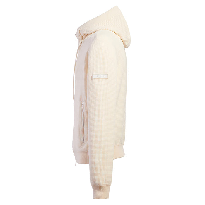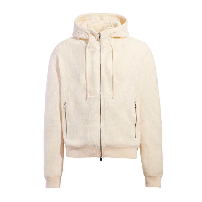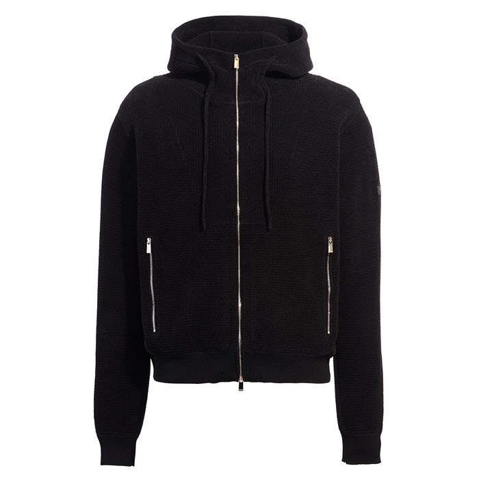 ベルベット調の糸を使用したフードタイプのニットブルゾン。